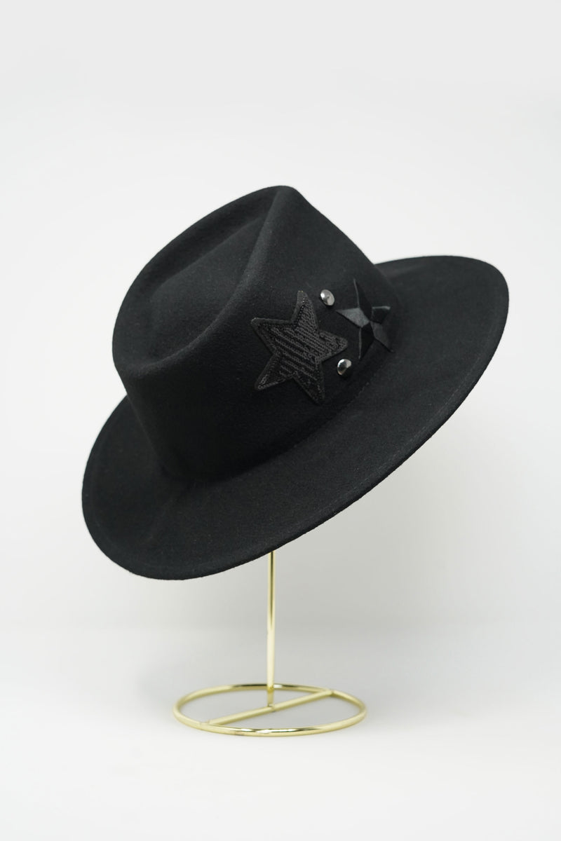 Flat wide brim fedora with stylish star patches. Snake skin band. Adjustable sweatband for secure and comfortable fit.